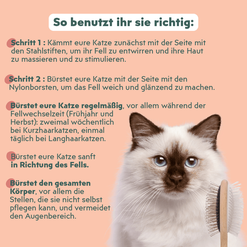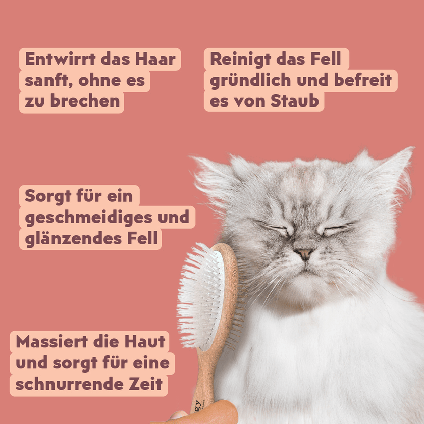 Unsere Bürste wird mit viel Liebe in der Nähe von Paris aus nachhaltig gewonnenem Eschenholz hergestellt. Diese doppelseitige Bürste ist zu 100 % vegan und extrem strapazierfähig. Sie ermöglicht es euch, das Fell Ihrer Katze zu bürsten, zu entwirren und zu pflegen:
