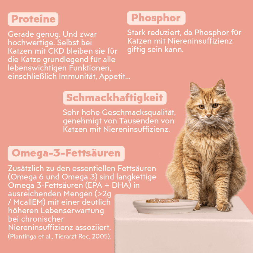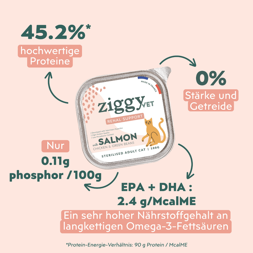 Das Ziggy VET CKD Nassfutter wurde entwickelt, um die Nierenfunktion bei chronischer Nierenerkrankung zu unterstützen: Dieses Diätfutter ist sehr phosphorarm (1 g/Mcal) zum Schutz der Nierenfunktion, reich an Omega-3 EPA/DHA (>2 g/Mcal) und besteht aus hochverdaulichen und absorbierbaren Proteinen mit einem Aminosäurenprofil, das auf den Bedarf von Katzen abgestimmt ist. So bleiben die Muskelmasse und der Appetit von CKD-Katzen erhalten und ihr Immunsystem wird gestärkt. Das Beste, was ihr tun könnt, um das Fortschreiten von CKD zu verlangsamen und gleichzeitig den Appetit zu fördern.