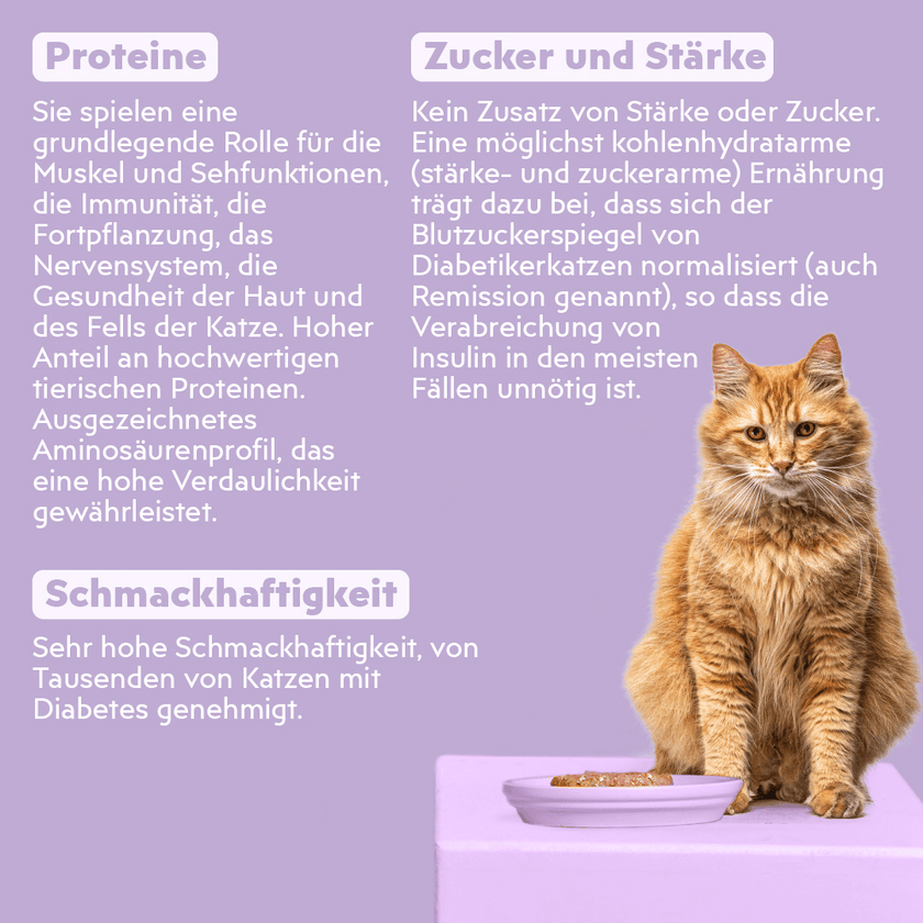 Das Ziggy Diabetes VET Nassfutter ist komplett getreidefrei und hat einen sehr niedrigen Zucker- und Stärkegehalt; dieses Futter wurde für Katzen mit Diabetes mellitus (diabetes mellitus) und Typ-II-Diabetes entwickelt, um ihnen täglich zu helfen, ihren Blutzuckerspiegel zu regulieren.