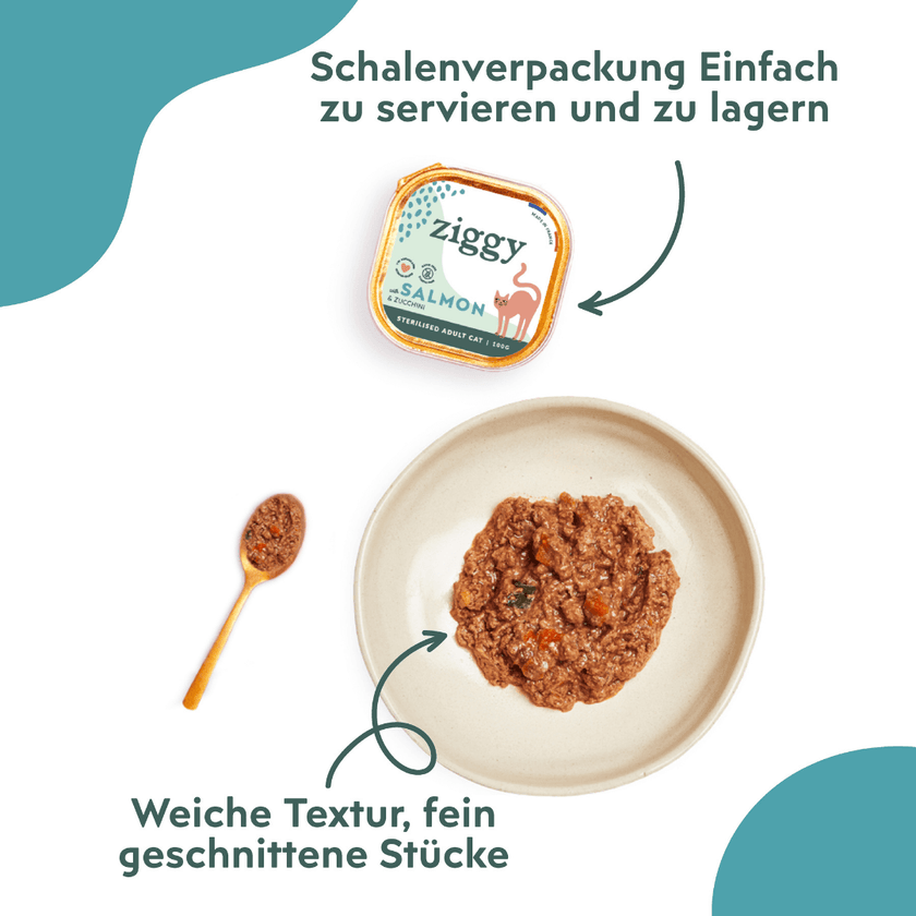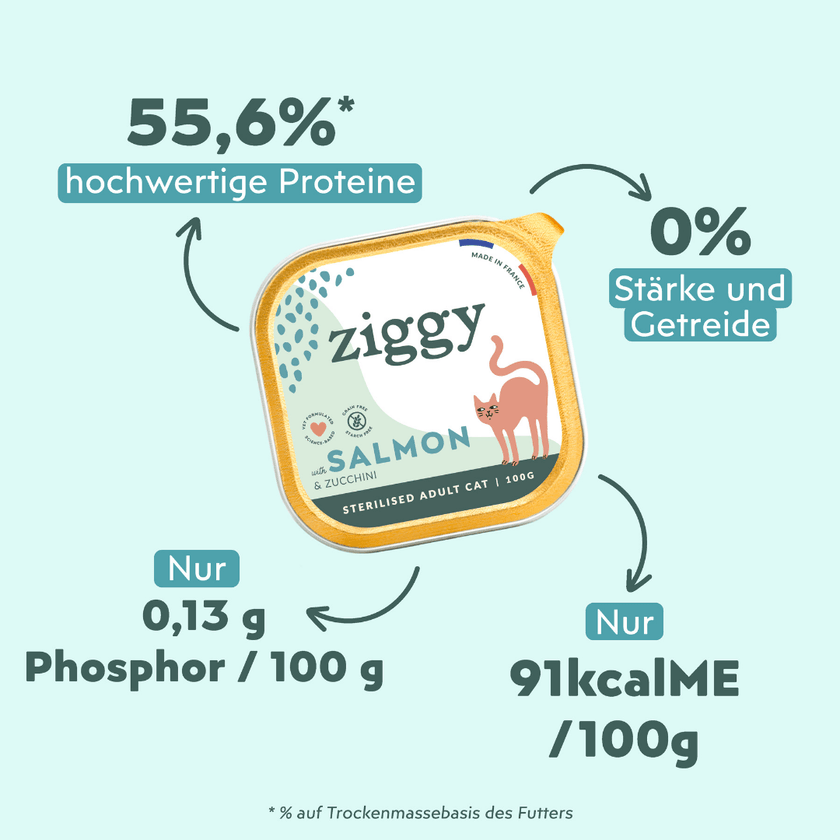 Stärke- und getreidefreies Nassfutter für erwachsene kastrierte Katzen mit köstlichem Lachs, hergestellt in Frankreich mit einer gesunden und ausgewogenen Nährstoffzusammensetzung, um eure Katze zu begeistern und gleichzeitig das Beste für ihre Gesundheit zu tun.