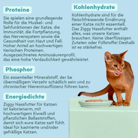 Reich an hochwertigen Proteinen mit über 72 % Muskelfleisch, hochwertigen Innereien und Filet, ist unser Nassfutter auch sehr arm an Kohlenhydraten (<0,5 %), optimal für anspruchsvolle, gierige oder Fisch liebende Katzen!