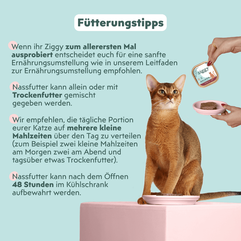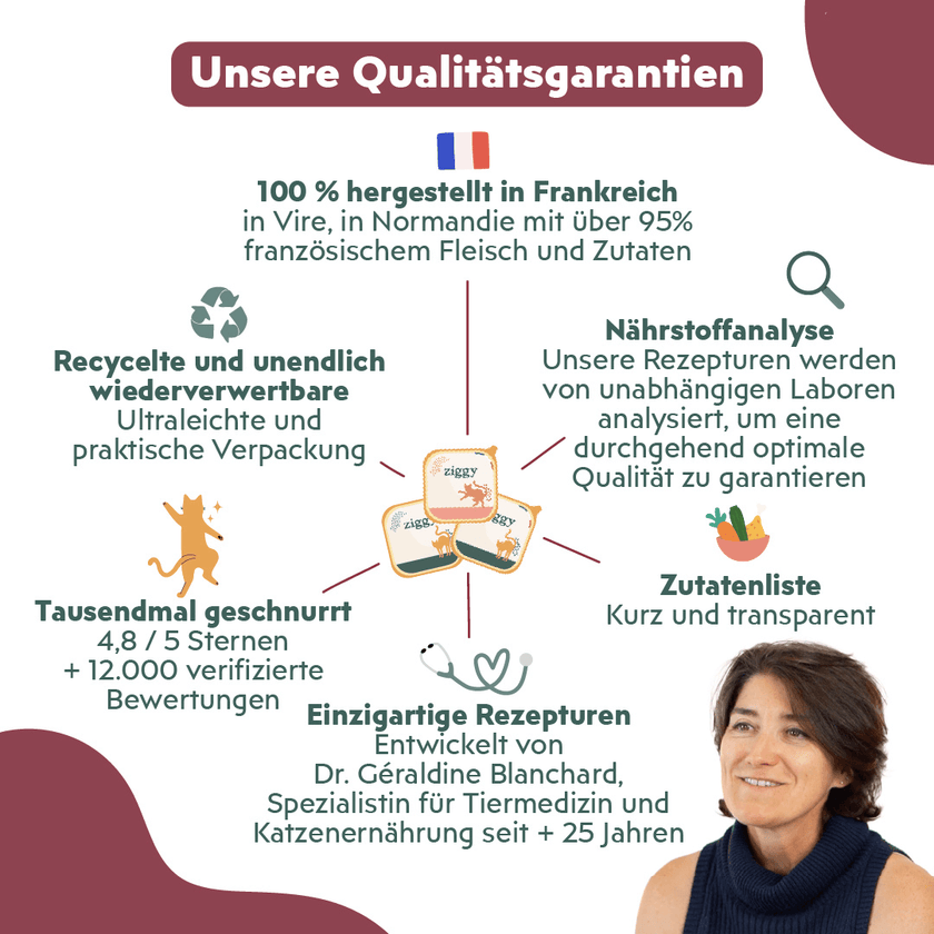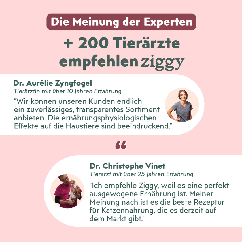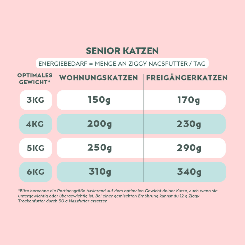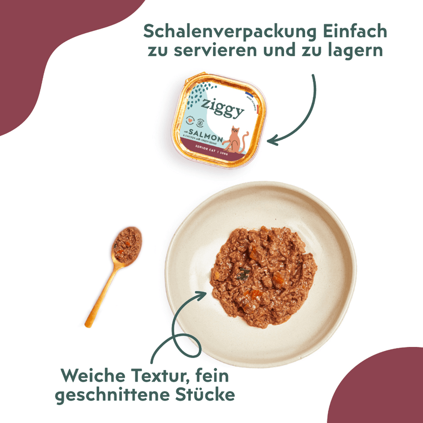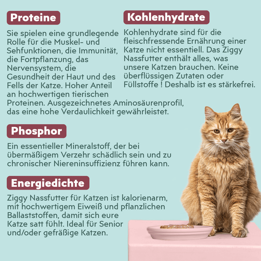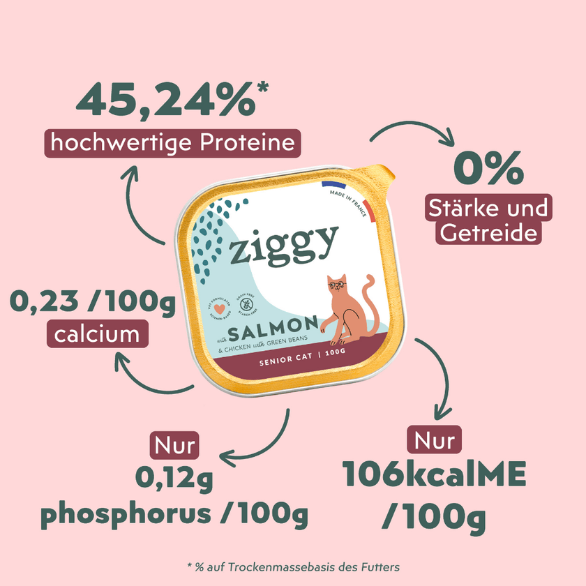 Bei Ziggy begleiten wir eure Katze durch jede Lebensphase. Mit zunehmendem Alter brauchen Katzen eine noch speziellere Ernährung, um gesund zu bleiben: weniger Phosphor, ausgezeichnete Proteinqualität und Fettsäuren zum Schutz ihrer Gelenke.