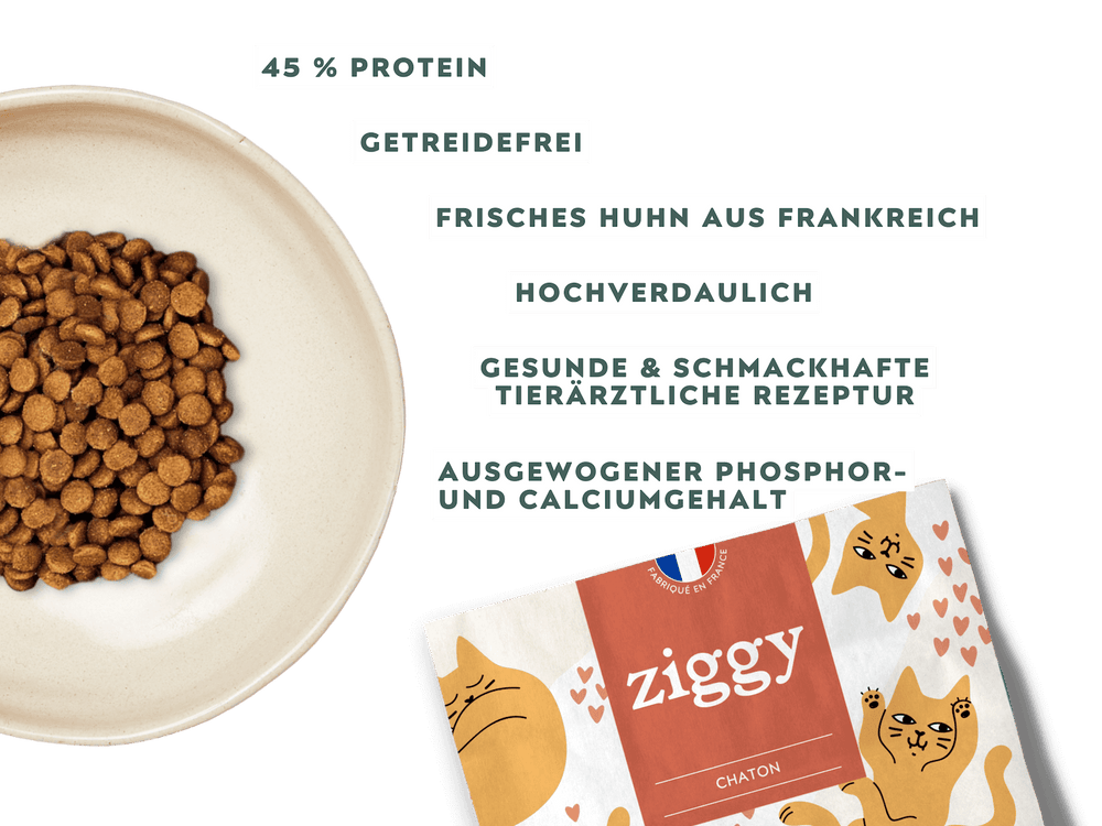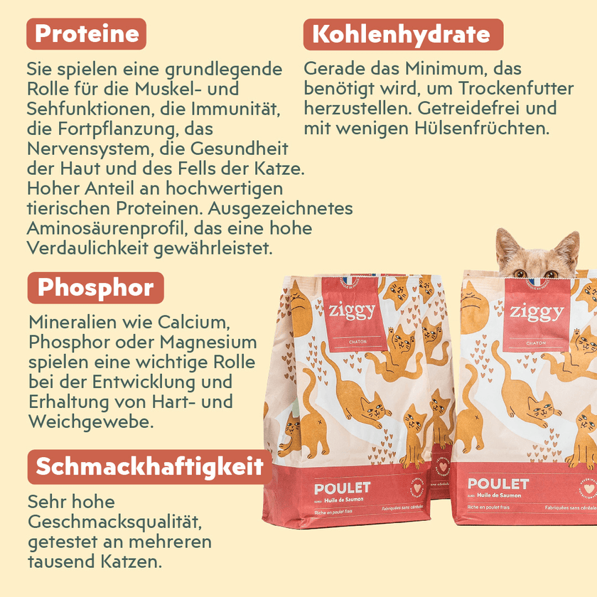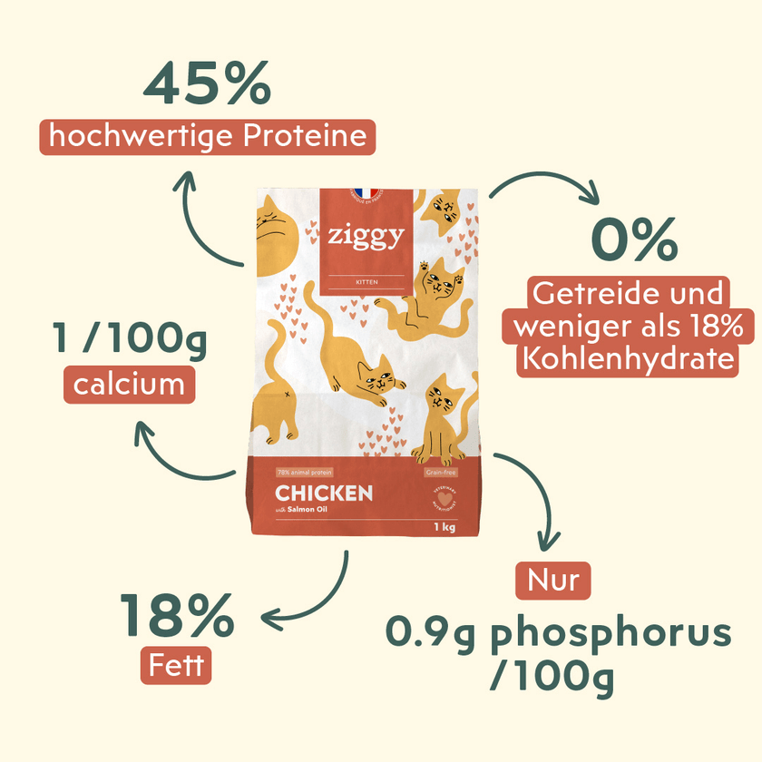 Entwickelt mit hervorragenden Premium-Proteinen, guten essentiellen Fettsäuren, ohne Getreide und mit sehr wenigen Kohlenhydraten, ist unser Trockenfutter ideal, um die gesunde Entwicklung eures Kätzchens sicherzustellen.. Der beste Start ins Leben einer Katze!