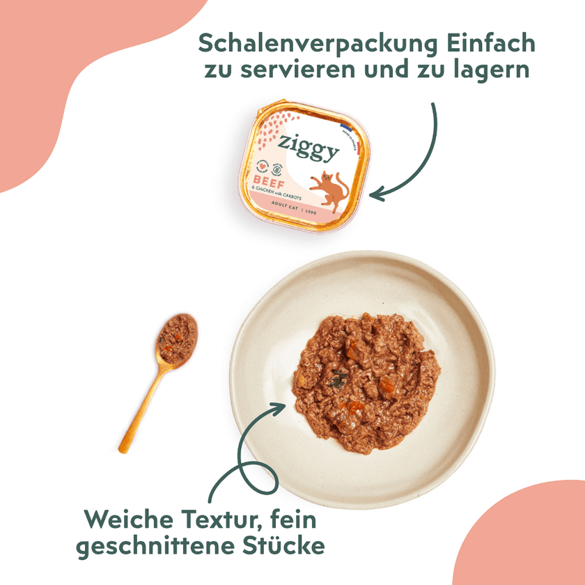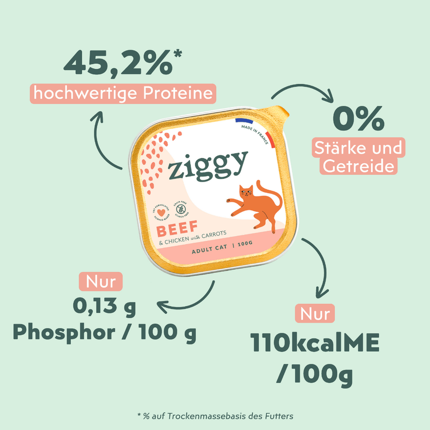Getreide- und stärkefreies Nassfutter für erwachsene Katzen mit köstlichem Rind, das euren Stubentiger begeistert.