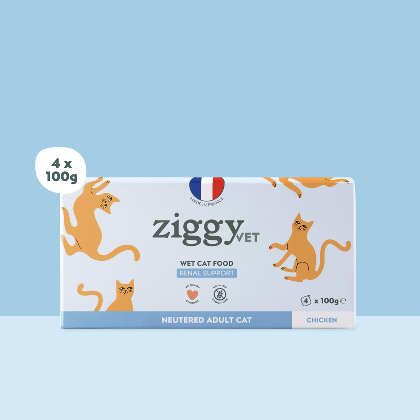 The Ziggy VET CKD wet food has been formulated to support renal function in cases of chronic kidney disease. This dietary food is very low in phosphorus (1g/Mcal) to preserve kidney function, rich in Omega 3 EPA/DHA (>2g/Mcal), containing highly digestible proteins, with an amino acid profile closely matching the needs of cats, to preserve muscle mass and the appetite of cats with CKD, and help strengthen their immune system. The best we can do when it comes to slowing down the onset of CKD while promoting a healthy appetite.