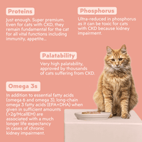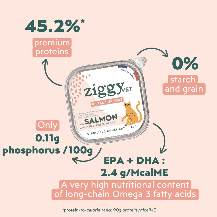 Ziggy VET CKD wet food has been formulated to support kidney function in cases of chronic kidney disease. This dietary food is very low in phosphorus (1g/Mcal) to protect kidney function, rich in Omega 3 EPA/DHA (>2g/Mcal), made with highly digestible and absorbable proteins, with an amino acid profile that matches cats' needs, to preserve muscle mass and appetite in CKD cats and help strengthen their immune system. It’s the best formula to slow the onset of CKD while maintaining their appetite.