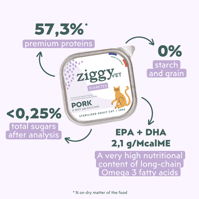 Ziggy Diabetes VET wet food is completely grain-free with a very low sugar and starch content. It's been specifically developed to help regulate daily blood sugar levels for cats suffering from diabetes mellitus (diabetes mellitus) and type II diabetes.