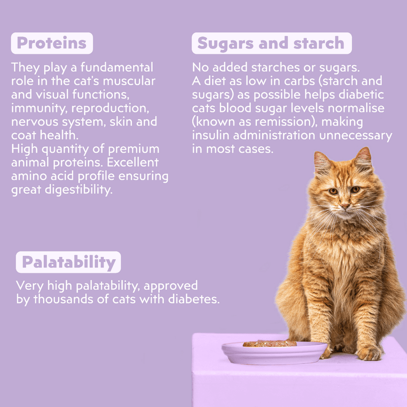 Wet food for diabetic adult cats, developed by vet and expert in feline nutrition, Dr. Géraldine Blanchard.