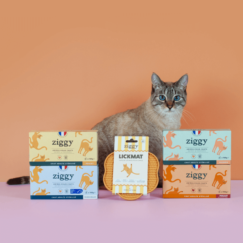 Nos 4 recettes de pâtées pour chat adulte stérilisé : des recettes uniques, développées par notre vétérinaire spécialiste en nutrition féline. Nos pâtées sont peu caloriques et contiennent des protéines hautement assimilables, de bons acides gras et des fibres pour une satiété optimale. Pas d'amidon, pas d'ingrédient de remplissage, uniquement de vrais bons ingrédients qui combleront l'appétit de votre gourmand. En bonus, notre tapis de léchage permet de ralentir la prise alimentaire et favorise la satiété tout en amusant et régalant votre chat !